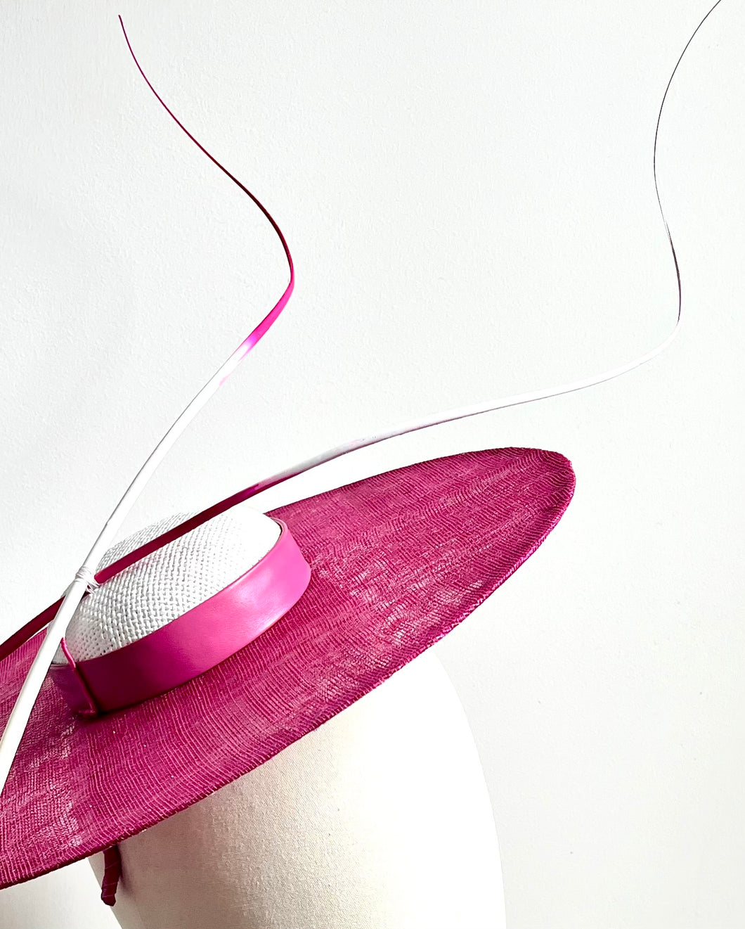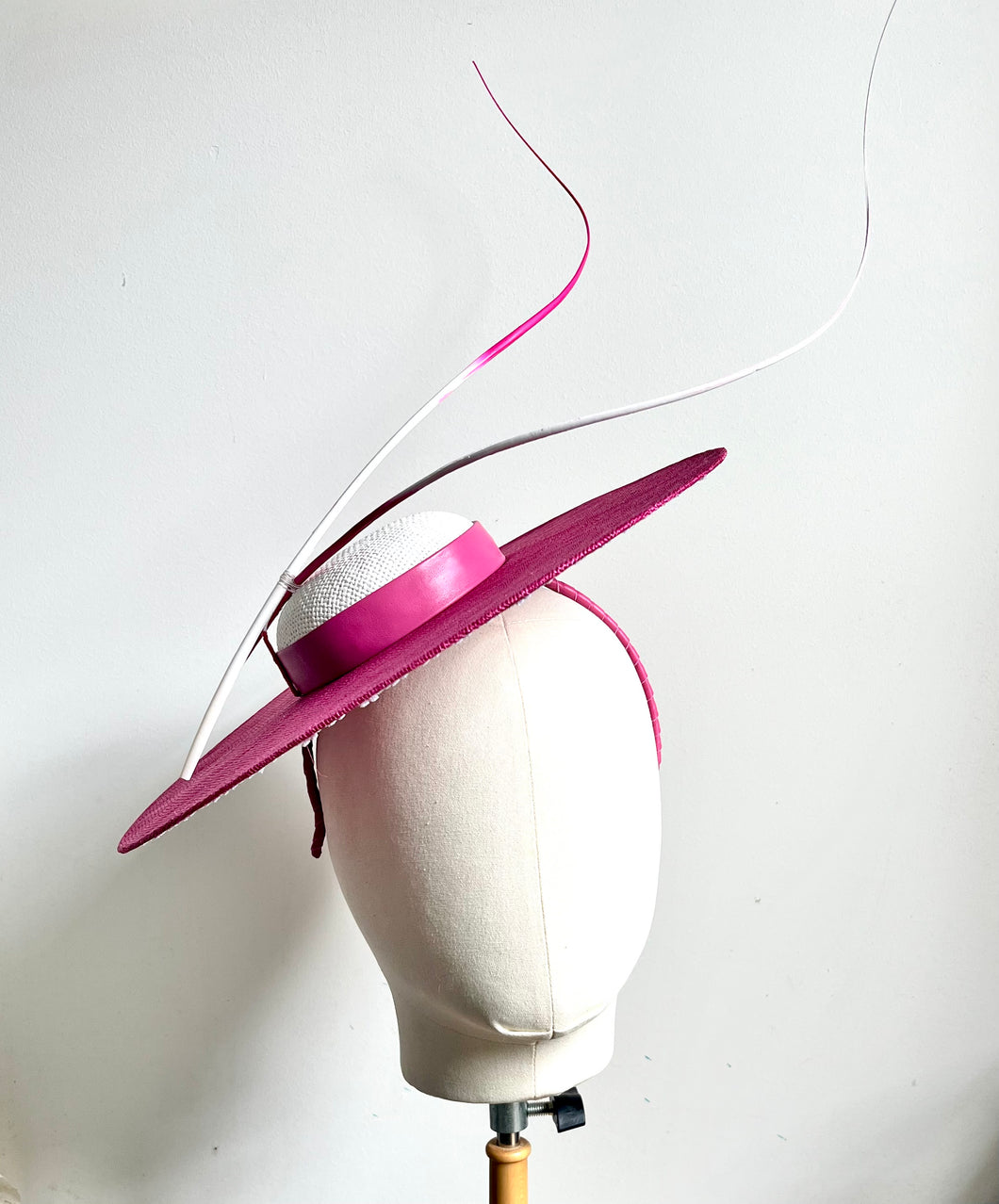 Hot pink and white hat in a leather wrapped headband