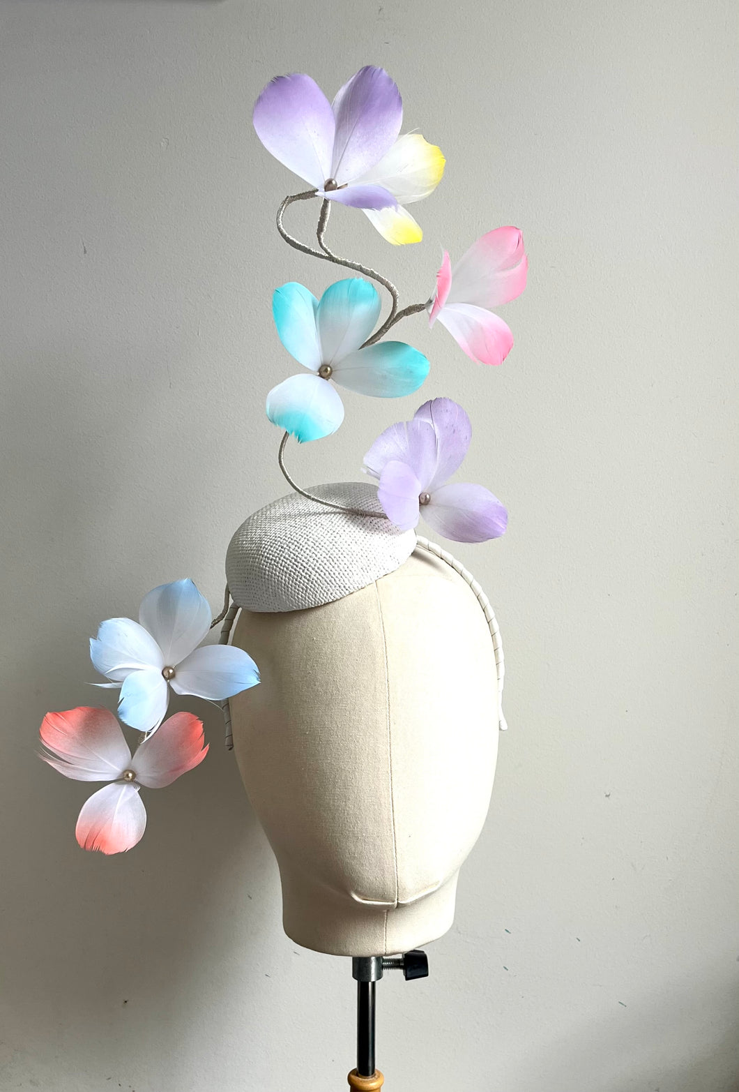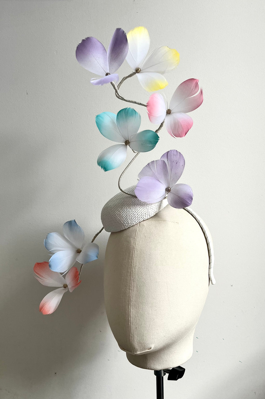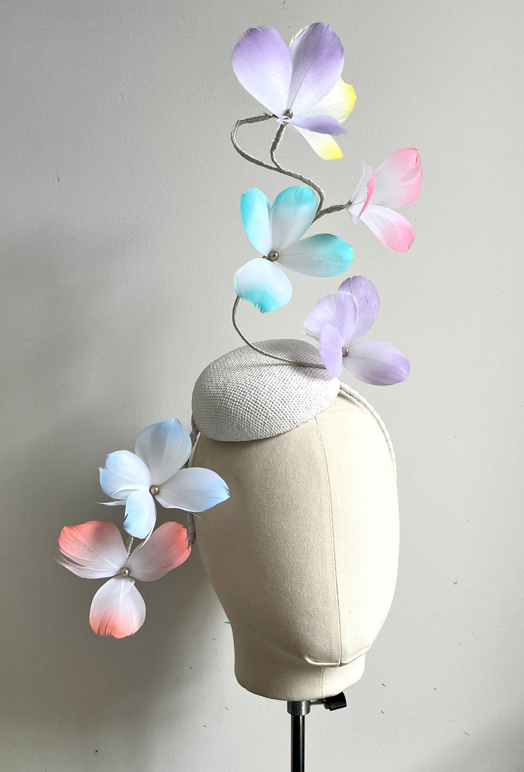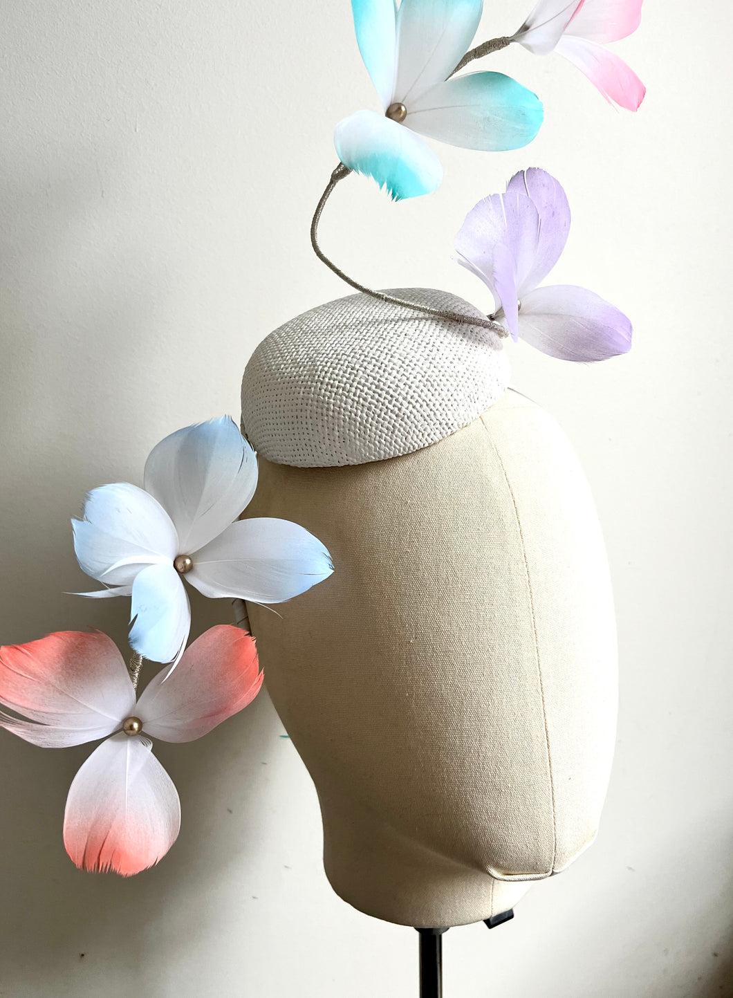 White button hat on a leather wrapped headband topped with pastel feather flowers